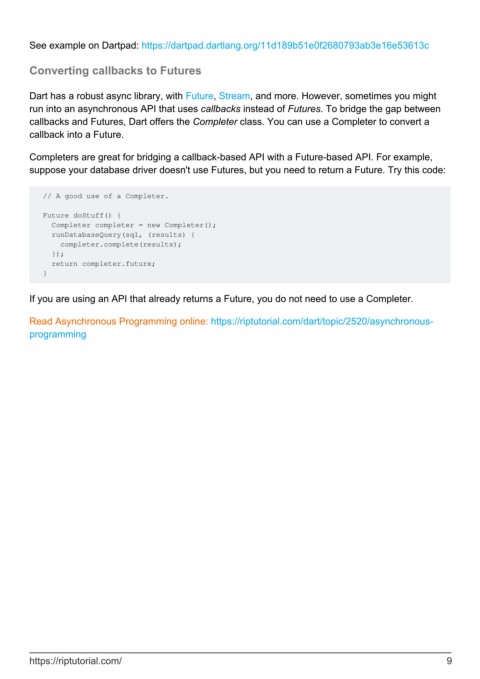 callbacks and Futures, Dart offers the Completer class. You can use a Completer to convert a