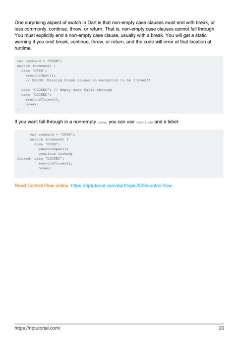 One surprising aspect of switch in Dart is that non-empty case clauses must end with break, or