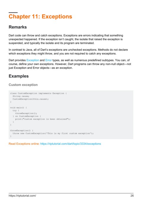 course, define your own exceptions. However, Dart programs can throw any non-null object—not