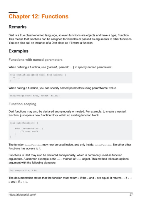 Dart functions may also be declared anonymously or nested. For example, to create a nested