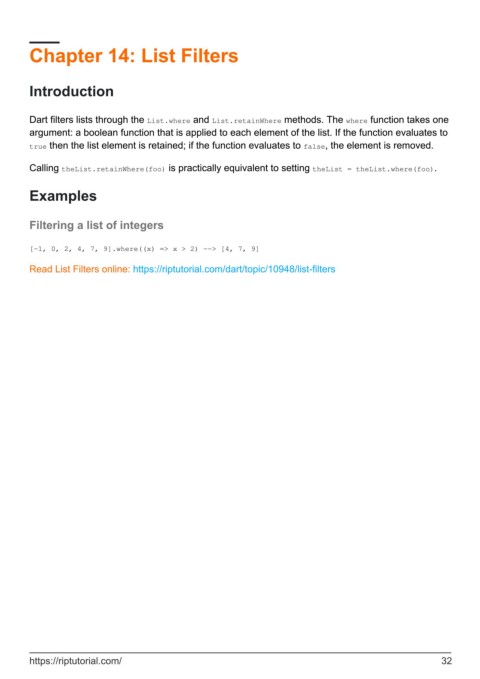 Dart filters lists through the List.where and List.retainWhere methods. The where function takes one